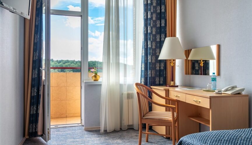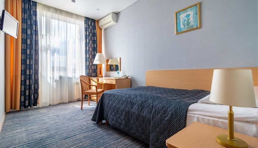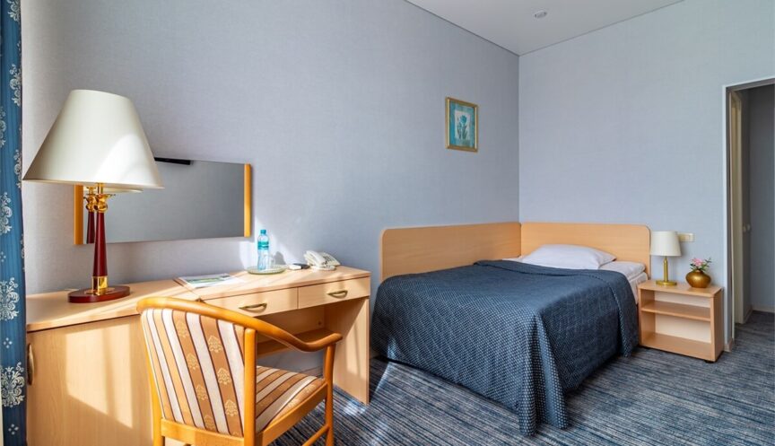 Одноместный однокомнатный стандарт (максимум 1 человек, площадь 14 кв. м). В номере: бесплатный Wi-Fi, телевизор, кондиционер, душ, фен, холодильник, балкон, односпальная кровать, туалет.